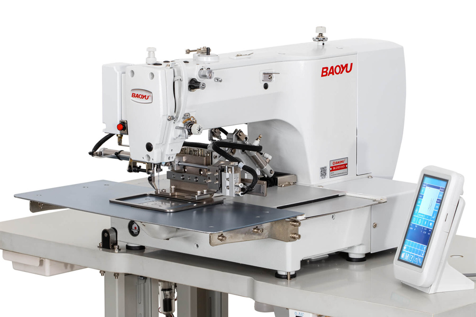 Baoyu BML-2210G-01A/CH оснащена пневматической отводной прижимной лапкой, которая надежно удерживает деталь во время шитья, предотвращая ее смещение. После завершения швейной операции лапка автоматически отводится в сторону. Оператор устанавливает деталь в шаблон, и машина автоматически выполняет процесс шитья, что значительно сокращает время по сравнению с традиционными швейными машинами. В комплекте с машиной идет стандартный прижимной шаблон для универсального применения.