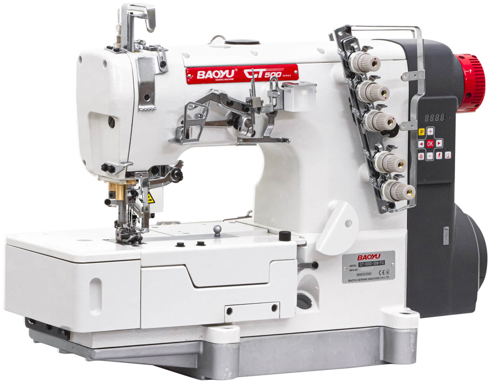 Baoyu GT-500D-FQ – универсальная промышленная трехигольная пятиниточная распошивальная машина с плоской рабочей платформой. Представленная модель применяется для выполнения стачивающих распошивальных операций, подгибки низа, обработки горловин, растачивания швов и окантовки врезным окантователем. Для обработки изделий декоративным швом с верхним застилом предусмотрен раскладчик нити.