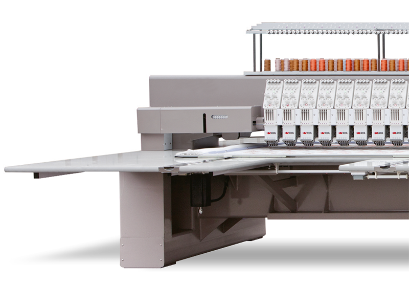 Основной вал приводится в действие двумя мощными сервомоторами, расположенными на двух его концах. Данное инновационное техническое решение позволяет сбалансировать нагрузку на вал супер многоголовых вышивальных машин, уменьшить искажение крутящего момента передачи и существенно снизить вероятность обрыва нити